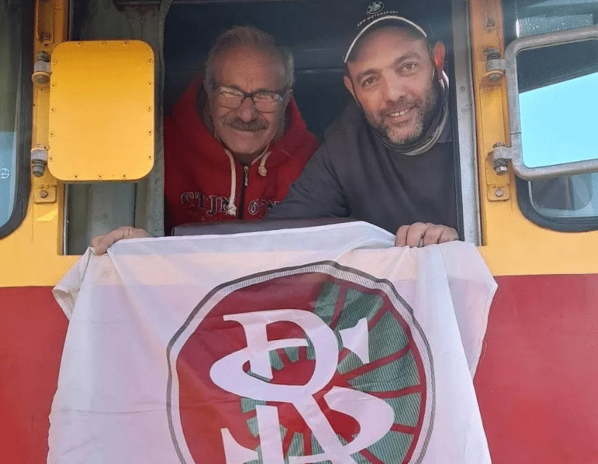 Vania luce la bandera de su asociación, junto a Alberto Capenti, otro apasionado por los trenes.