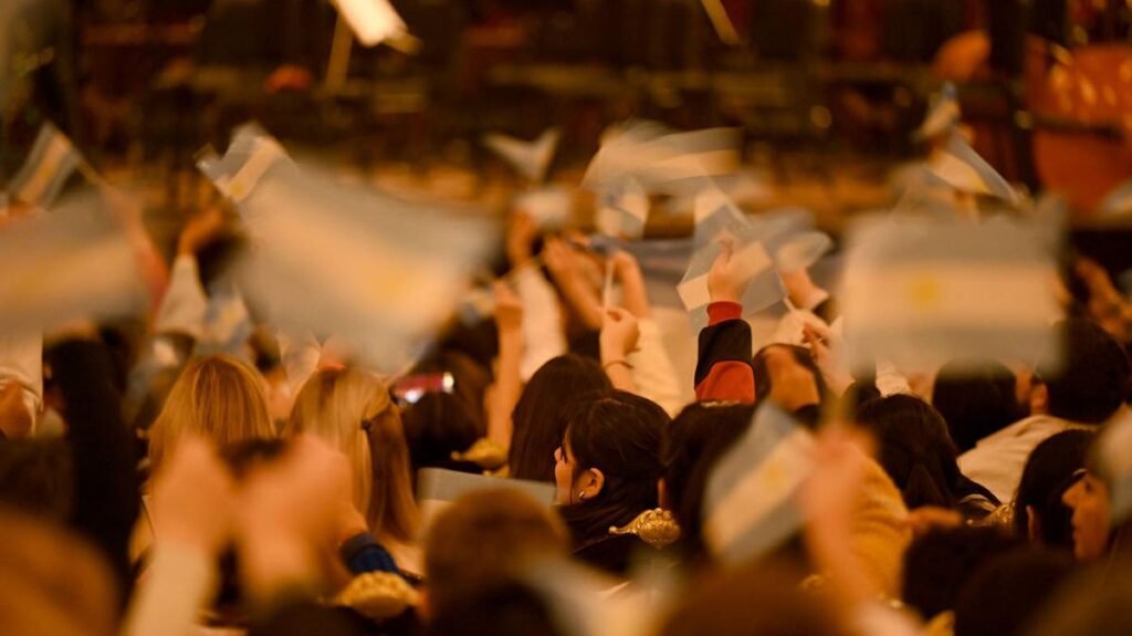 Cientos de jóvenes construyeron un gran marco en el Teatro Colón con banderas argentinas.