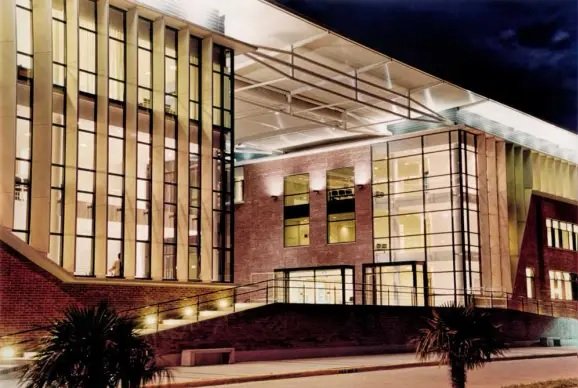 La sede, alimentada por la energía solar y su postal nocturna.
