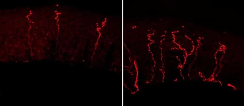 Una de las pruebas en lo ratones, muestra la evolución en la disminución de los axones (primera imagen).