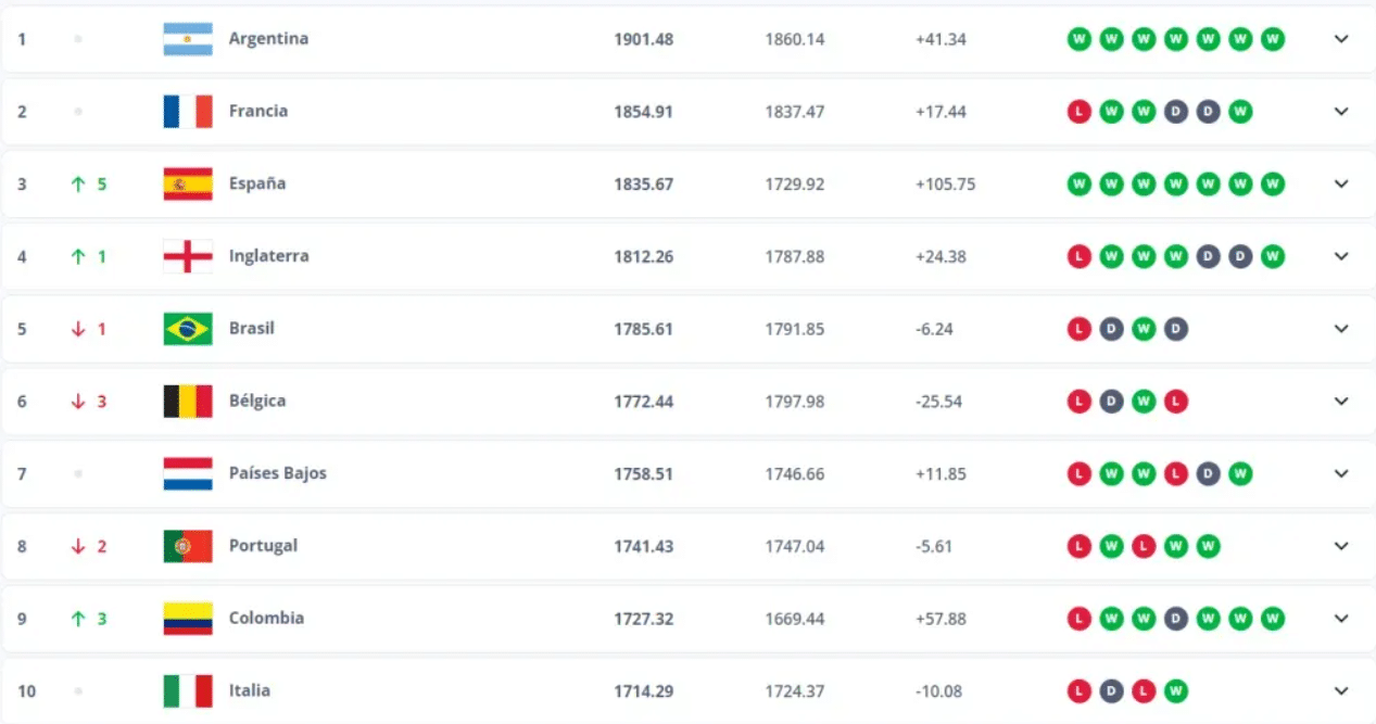 Más abajo, en el sexto puesto, aparece Bélgica, que ya no es el mismo seleccionado que era hace unos años. En tanto, Países Bajos -séptimo-, Portugal -octavo-, Colombia -noveno- e Italia -décimo- son quienes completan el Top 10 del Ranking FIFA.