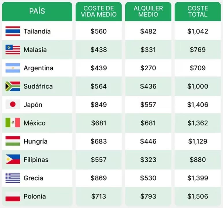 En nuestro país hay 72.000 trabajadores de este tipo y todos destacan en que obtienen el menor costo de vida de los 10 países más populares. Mientras que acá se necesitan USD 709 para vivir por mes, en lugares como Tailandia y Malasia se requieren USD 1.042 y USD 769, respectivamente.