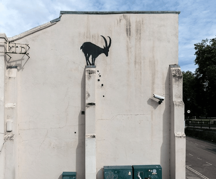 Entre lunes y martes, Banksy se hizo cargo de ambas obras de arte animal. La primera en torno a una cabra en lo alto de una cornisa de la que se desprenden varias rocas mientras una cámara real de vigilancia apunta hacia ella.