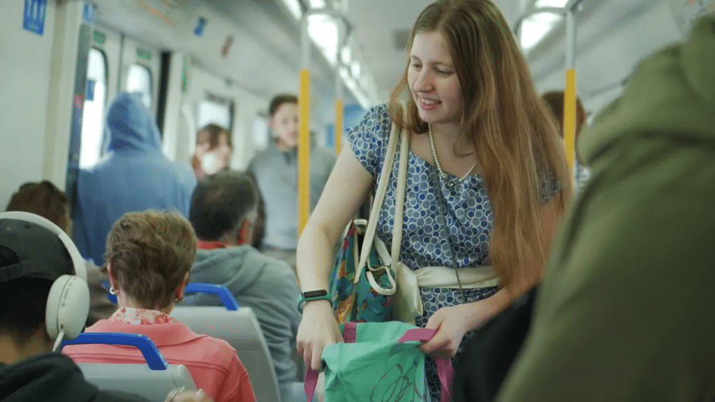 Durante los viajes que realiza en el Tren Mitre para recaudar fondos, Aimé canta ópera y la gente escucha asombrada.