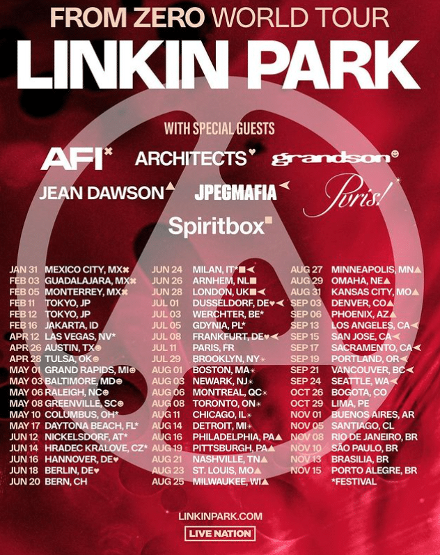 Por medio de sus redes oficiales, Linkin Park publicó un nuevo calendario de su nueva gira con un total de 59 fechas. La banda hará una gran gira por Latinoamérica, siendo la ciudad de Buenos Aires. Los fanáticos argentinos podrán ver una vez más a la agrupación el 1 de noviembre del año 2025.