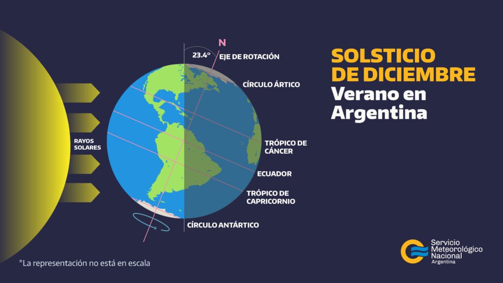 El Servicio de Hidrografía Naval de la Argentina detalló que en el país el verano astronómico 2023-2024 comenzará exactamente el viernes 22 de diciembre de 2023 a las 00.27. Ese día será el más largo del año. A partir de ese momento, los días irán acortándose gradualmente hasta llegar al equinoccio de otoño, que será el 20 de marzo de 2024. El solsticio de verano se produce cuando el sol está ubicado sobre el trópico de Cáncer, que se encuentra a 23,5° de latitud norte y atraviesa México, las Bahamas, Egipto, Arabia Saudita, India y el sur de China.