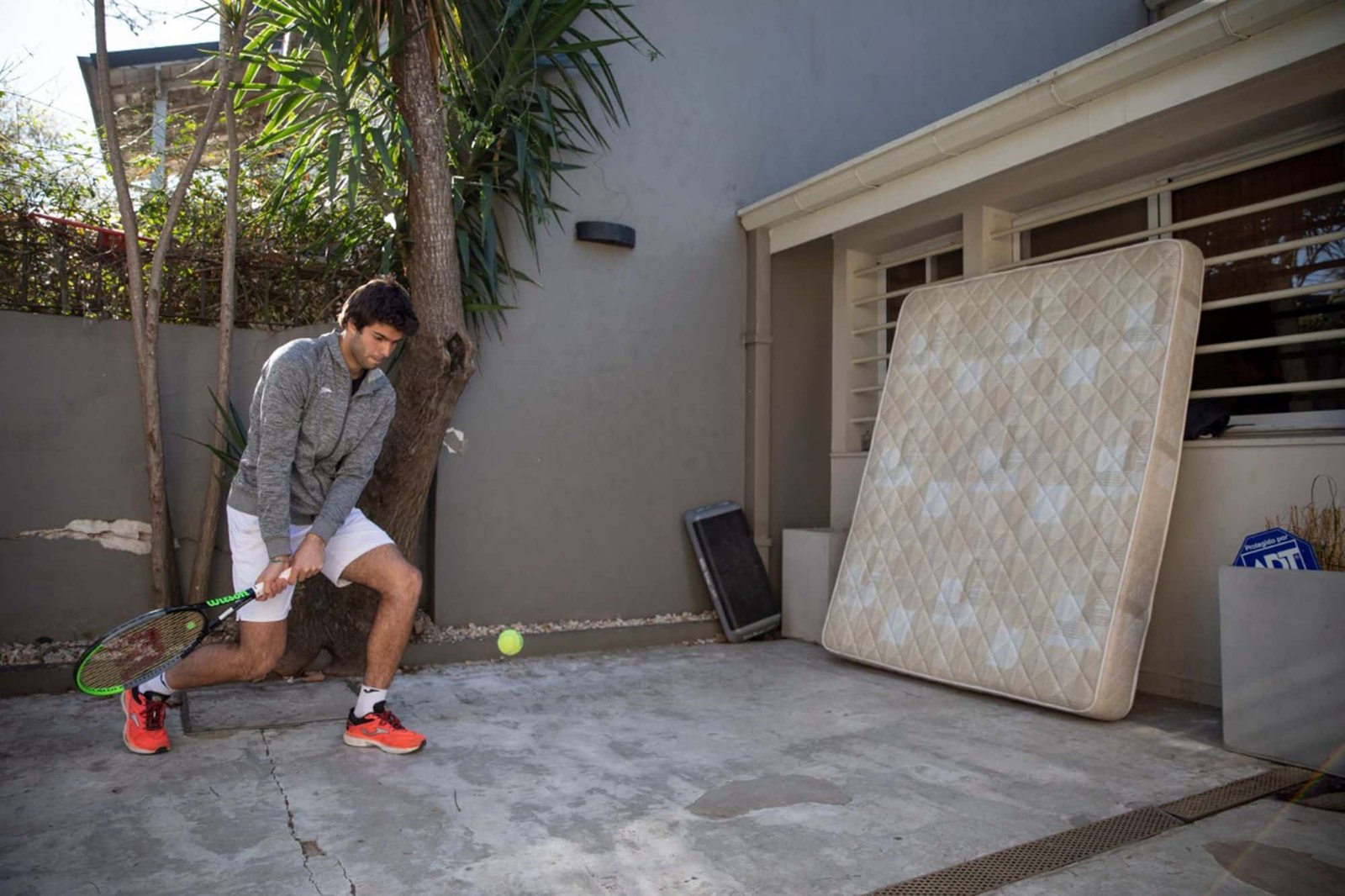 El joven tenista utilizó un colchón para entrenar durante la cuarentena.