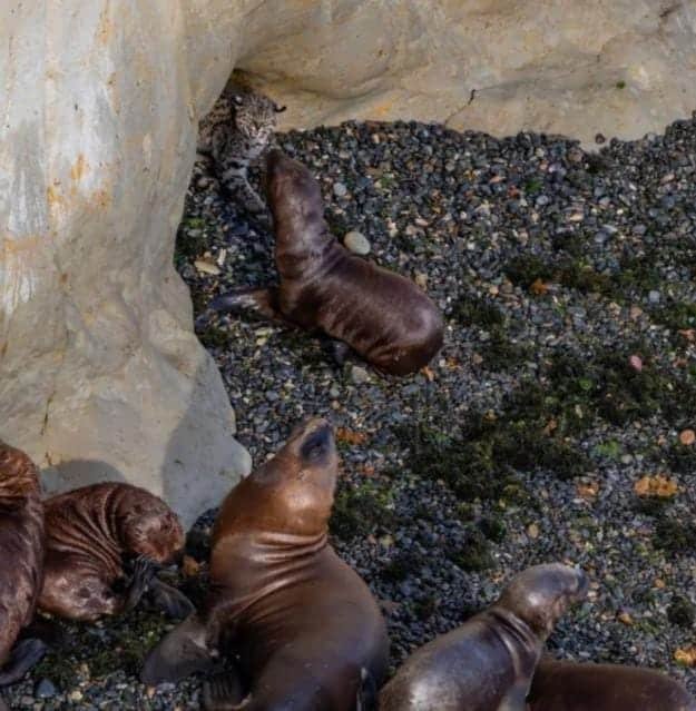 Descubrieron un gato montés conviviendo con lobos marinos en Chubut