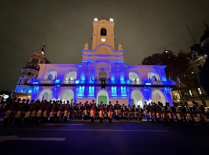 Los granaderos y el típico desfile frente al cabildo en Plaza de Mayo.