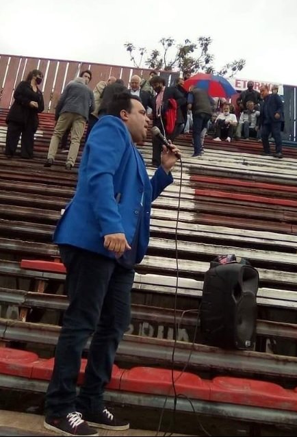 Ni la lluvia lo para: Augusto animando en la cancha del Charrúa.