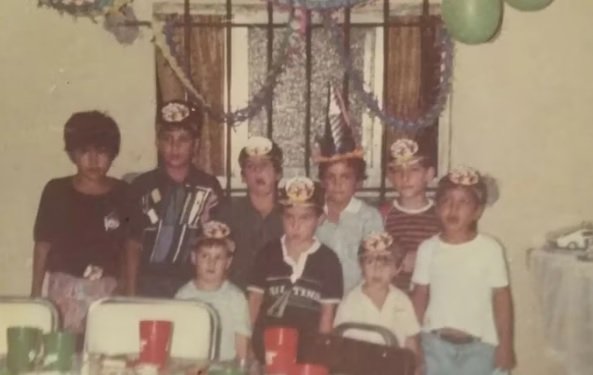 Leo, el primero abajo a la izquierda, junto a Salina, en el centro del grupo, en un cumpleaños.