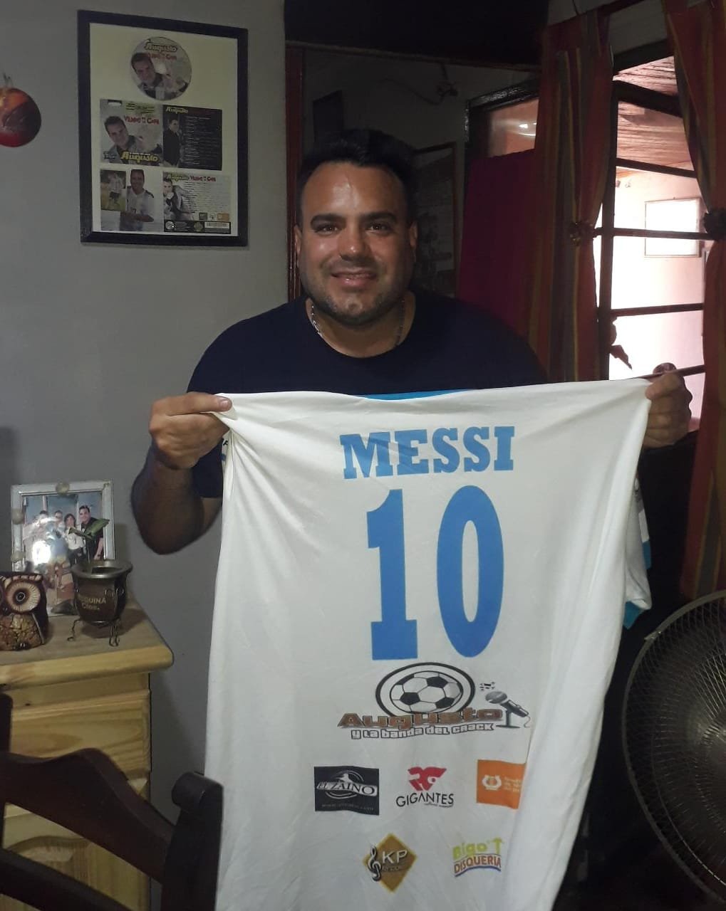 Con la camiseta que diseñó junto a Matías Messi, hermano del 10, para jugar un torneo barrial.