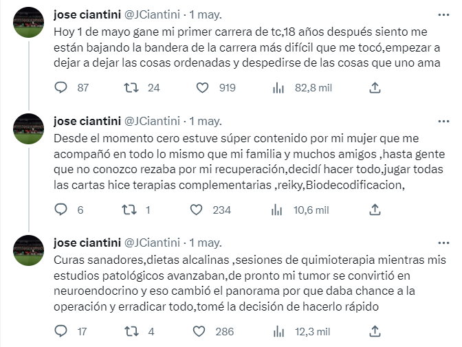José Ciantini, el Bocha para casi todos, tipo querido en un ambiente del automovilismo que recorre desde hace más de 30 años, piloto de Turismo Carretera, hombre de Balcarce, de siembra y cosecha, de empresa familiar, fue sorprendido por un diagnóstico médico en enero de este año, cuando le contaron que padecía cáncer de páncreas. Se animó a exponerse y a contarlo a través de Twitter y recibió una hermosa reacción de buena energía de gente que le deseaba una buena recuperación. Después se entregó a la medicina, a las terapias alternativas y al optimismo por superarlo, y ahora -con un alentador pronóstico profesional- conversa con ADN+ sobre los aprendizajes y los procesos que vivió, las enseñanzas que busca compartir y las pasiones que no dejan de acompañarlo.