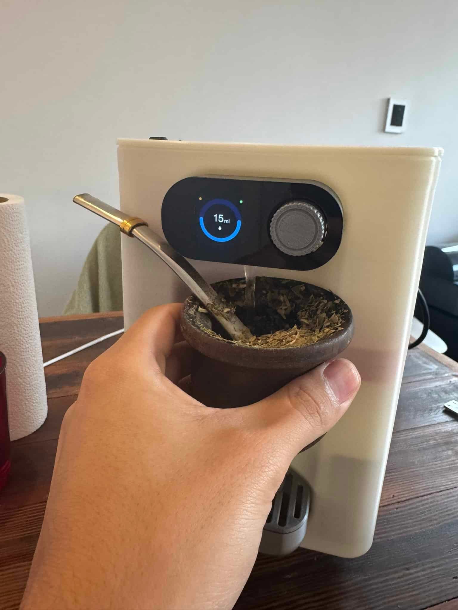 Mate listo. El aparato calcula el agua justa y corta automáticamente.