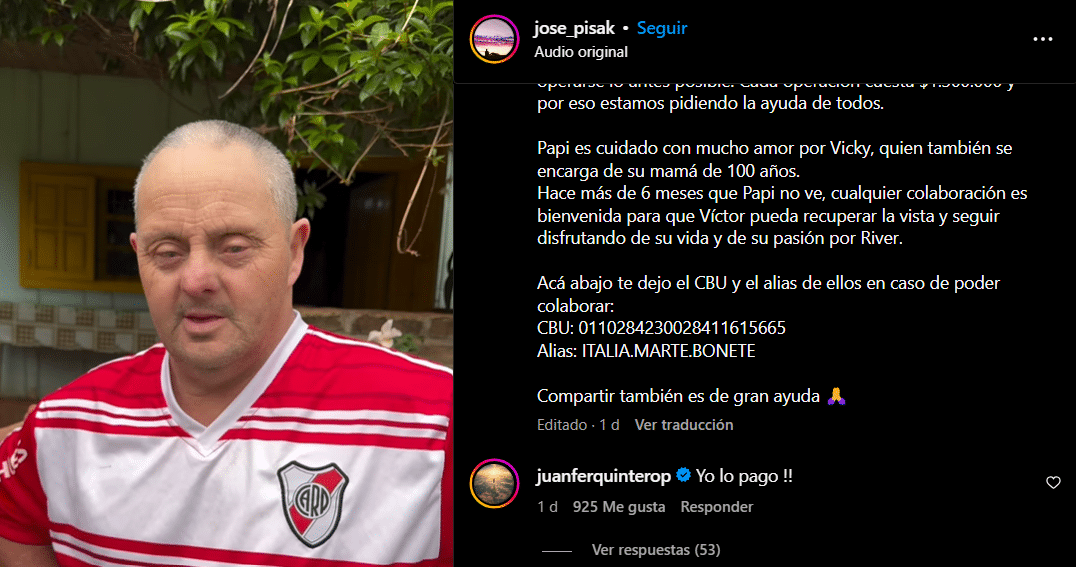 «‘Papi’ es cuidado con mucho amor por Vicky, quien también se encarga de su mamá de 100 años. Hace más de seis meses que ‘Papi’ no ve, cualquier colaboración es bienvenida para que Víctor pueda recuperar la vista y seguir disfrutando de su vida y de su pasión, River», concluyó.