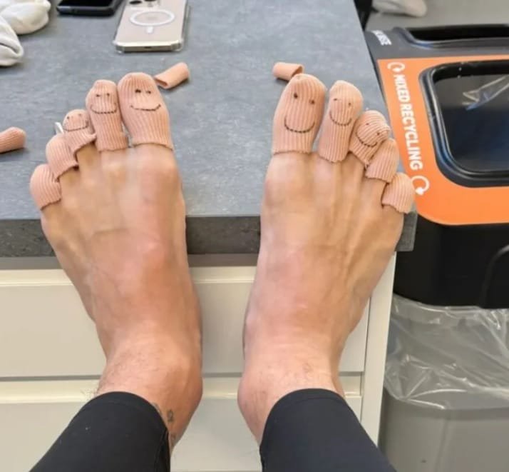 El campeón del mundo mostró cómo llevó a cabo las curaciones pertinentes en los dedos de sus pies. Pero esto no fue todo: agarró una lapicera y garabateó los apósitos con caritas felices por todos lados.