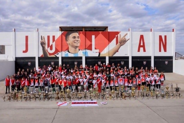 El mural de Julián Álvarez, en una de las tribunas del club. Posaron todas las categorías.
