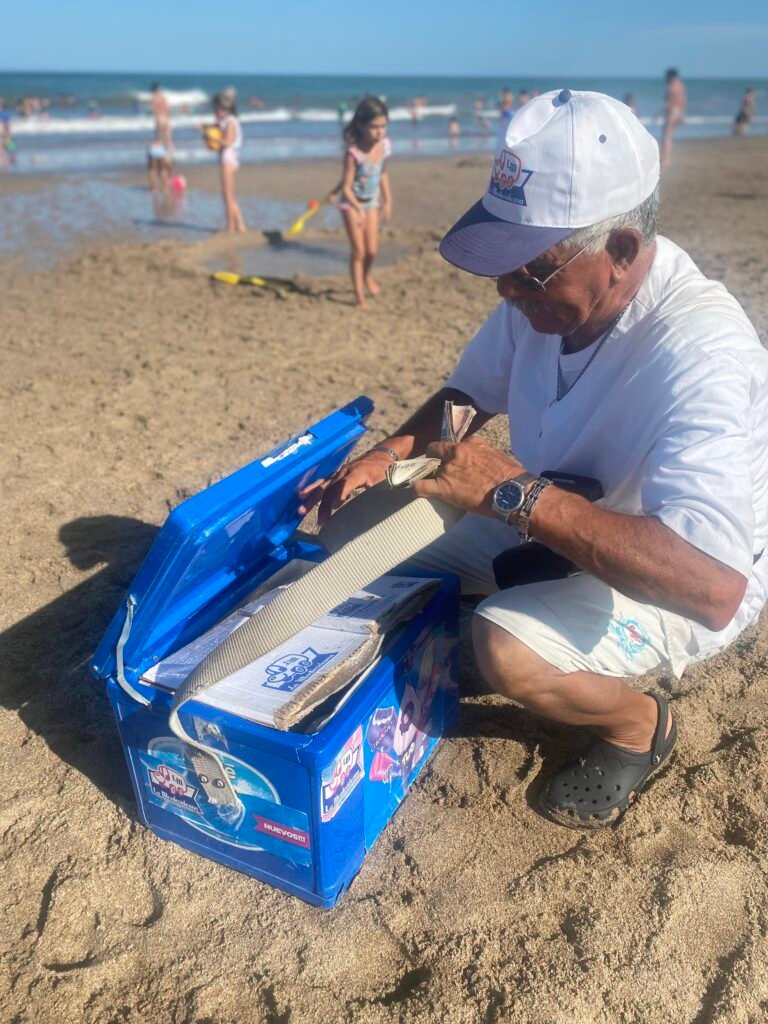 “Hace 50 años que soy vendedor ambulante en esta zona, empecé con mi hermano Luis cuando tenía 21 y la playa y las temporadas eran muy diferentes a lo que son hoy. Arrancamos vendiendo café en las carpas, porque antes los balnearios no tenían servicios como tienen ahora, y fuimos ganándonos el lugar con esfuerzo, con trabajo, con dedicación”, cuenta Hugo, casado con María Alejandrina y padre de dos hijas y un hijo, todos profesionales.