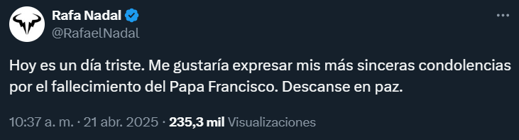 Figuras de la talla de Lionel Messi, Rafael Nadal, Gianni Infantino y compañía, entre muchos otros, aparecieron en escena por intermedio de las redes sociales para pronunciarse sobre el fallecimiento del sumo pontífice.