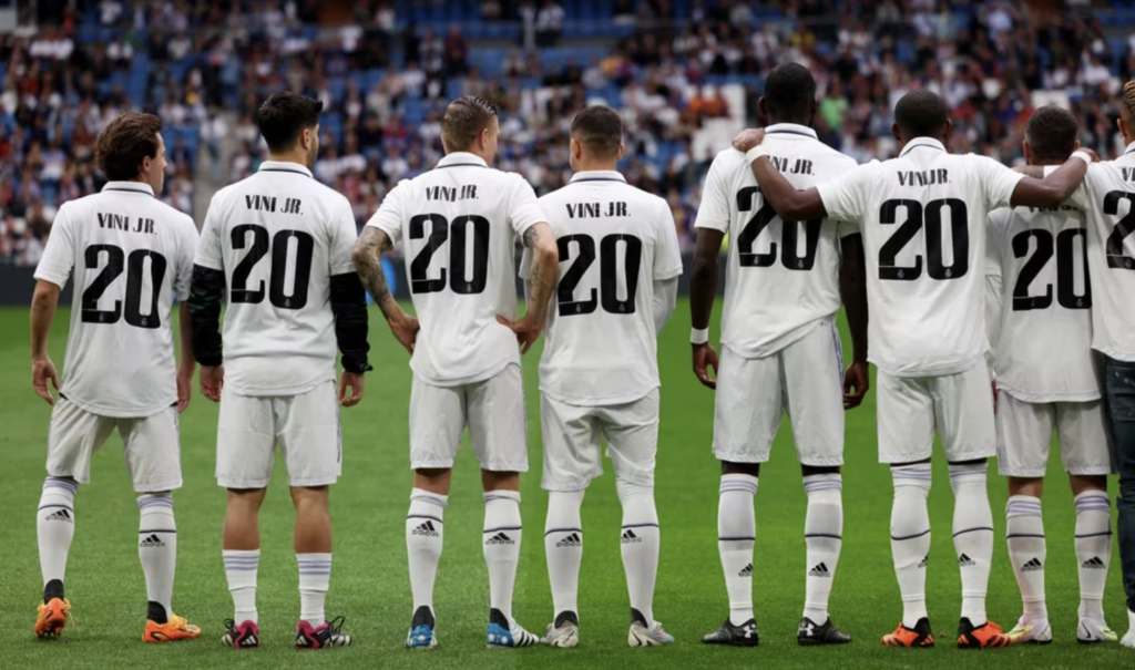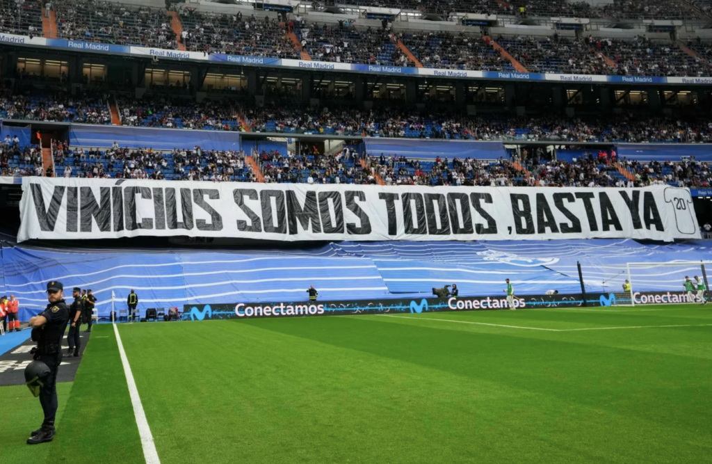 “Vinicius somos todos, basta ya”, decía la bandera gigante que el Real Madrid colgó en una de las gradas del Santiago Bernabéu. Además, todos los jugadores del equipo salieron a la cancha con una camiseta con el dorsal número 20, el que utiliza el extremo brasileño. Los futbolistas de ambos equipos también posaron con una pancarta de La Liga que pronunciaba “Racistas fuera del fútbol”.