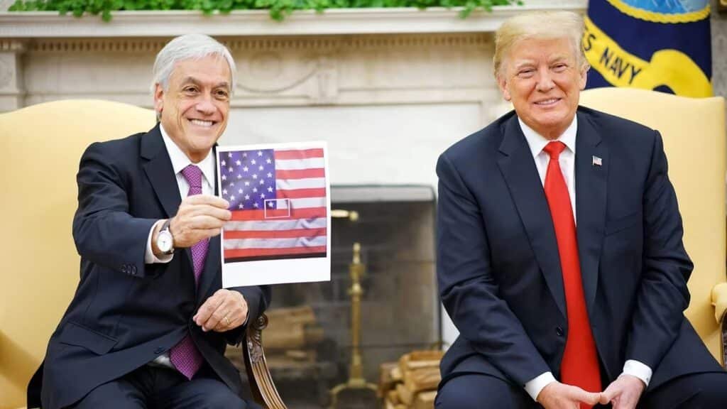 El presidente de Chile, Sebastián Piñera, exhibió en su reunión con Donald Trump -en la Casa Blanca en el 2018- una curiosa bandera de Estados Unidos, que en unos de sus fragmentos tenía una bandera chilena inserta.