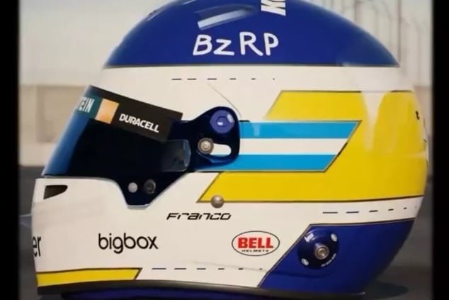 “Homenaje de un argentino a otro argentino”, así presentó su sentido homenaje Colapinto. El casco, azul y amarillo, con la bandera de argentina, rememora la última etapa del santafesino en la Fórmula 1.