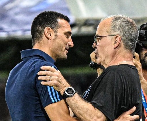 Marcelo Bielsa estuvo a punto de emocionarse cuando Pablo Aimar y Lionel Scaloni se acercaron a saludarlo con una notoria admiración y el mayor de los respetos en los instanstes previos al comienzo del partido entre Argentina y Uruguay en la Bombonera por la quinta fecha de las Eliminatorias para el Mundial 2026. «Lo veo triunfando y me alegro mucho», le dijo primero el entrenador de la Celeste al Payaso, mientras que las palabras del Loco hacia Scaloni fueron mucho más contundentes y elogiosas: «Un equipo de autor en su primera experiencia. Lo felicito».