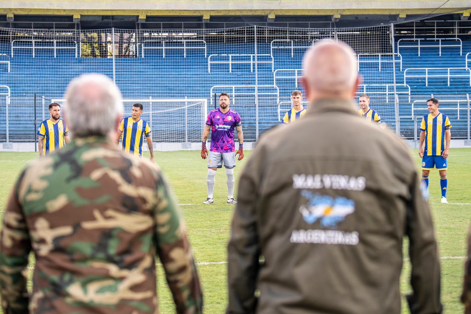 El equipo de Primera de Central, junto a los Veteranos de guerra, en el Gigante de Arroyito.