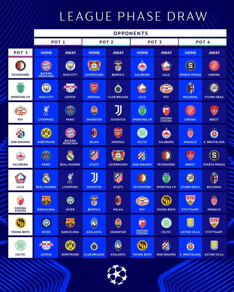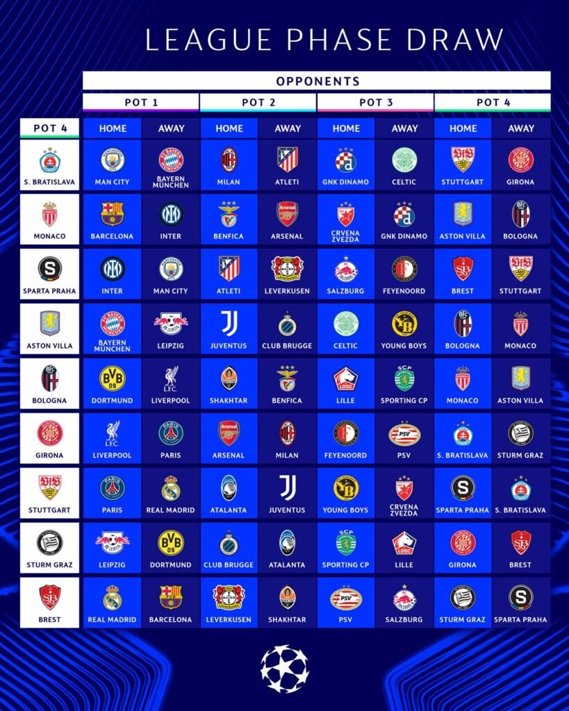 Los partidos serán divididos en dos, cuatro se jugarán de local y los restantes serán de visitante. Los 36 clubes se repartieron en cuatro bombos diferentes para el sorteo y cada uno deberá enfrentar a dos instituciones de cada bombo.