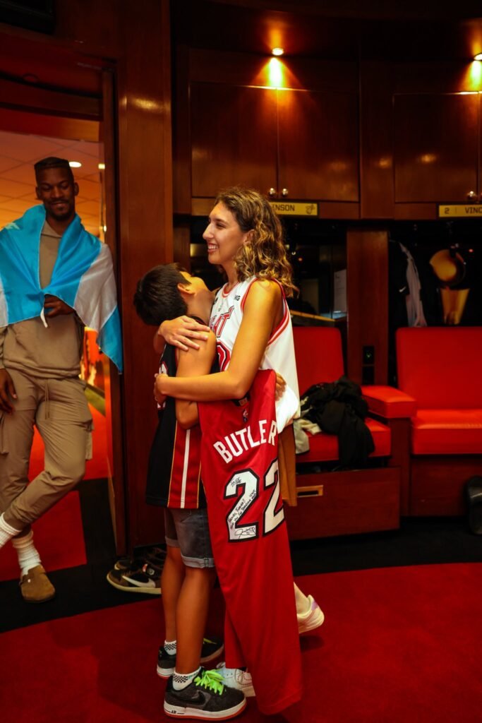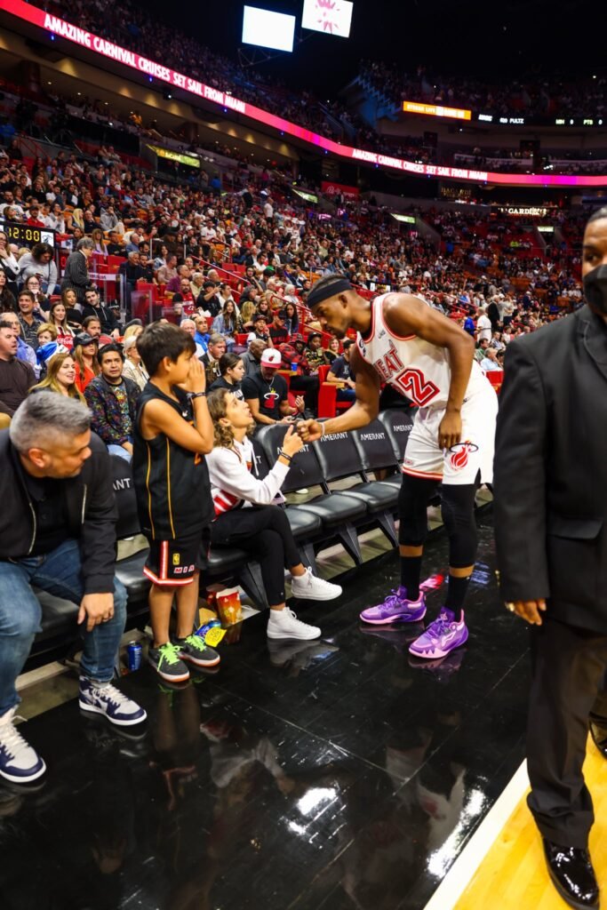 «Cuando me doy cuenta, gente del staff del Heat se estaba comunicando conmigo porque habían visto el video. Lo que procedió a llevarnos a la cancha en el entretiempo para darnos en vivo regalos que había mandado Jimmy desde su casa!!», cuenta Zoe Velázquez, en lo que fue apenas el comienzo de esta emotiva y fastástica historia. El siguiente capítulo fue cuando ubicaron a ella y a Felipe en dos butacas de la cuarta fila del FTX Arena. «Terminando de ver el partido se me acerca alguien y me pregunta si nosotros éramos los del video. Era el representante de Jimmy (tipazo), que procede a decirme que Jimmy nos quería conocer», recuerda Zoe.