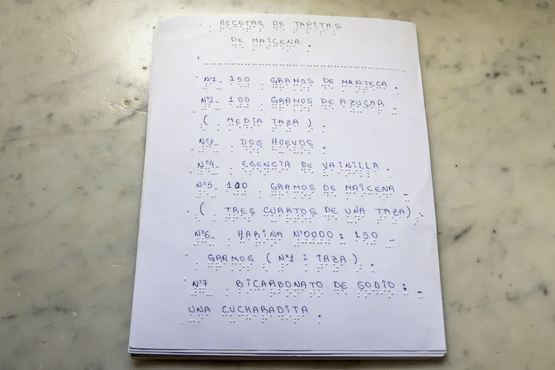Una receta de tapitas de maicena, escrita en sistema Braille, que llevan a cabo los estudiantes.