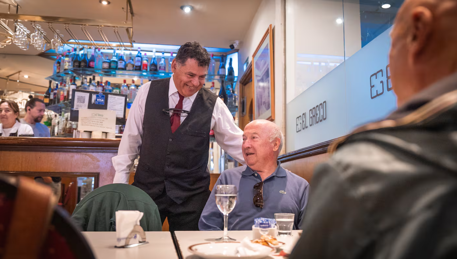 Agustín Báez, un mozo de 61 años de edad, imita sonidos de animales en el mítico bar "El Greco", ubicado en el barrio porteño de Caballito.