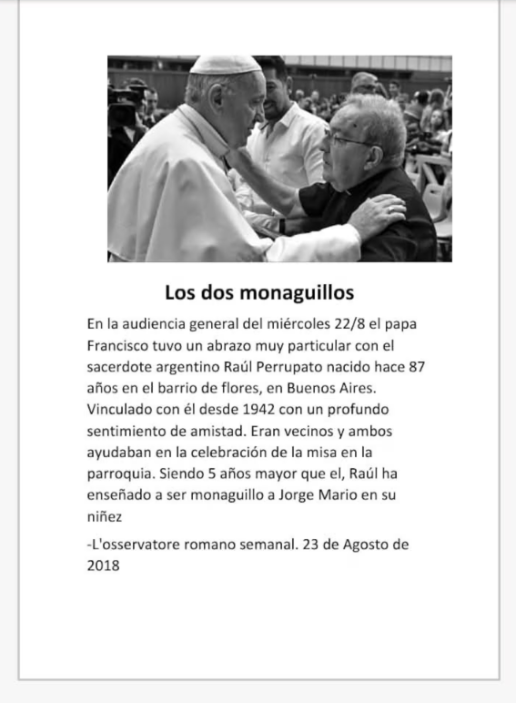 Inclusive, el 23 de agosto de 2018, el medio de comunicación ‘L’osservatore Romano’, publicó una nota titulada «Los Dos Monaguillos». En la misma contó que, en la audiencia general del día anterior, Francisco se había abrazado con Perrupato.