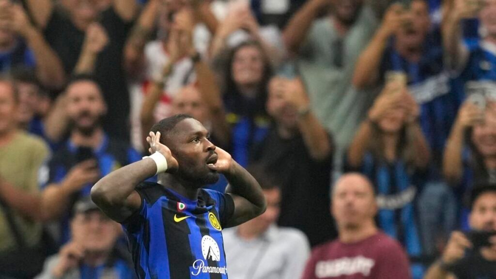 Inter Milan’s Marcus Thuram celebrates after scoring his side’s 2nd goal during a Serie A soccer match between Inter Milan and AC Milan at the San Siro stadium in Milan, Italy, Saturday, Sept.16, 2023. (AP Photo/Antonio Calanni)