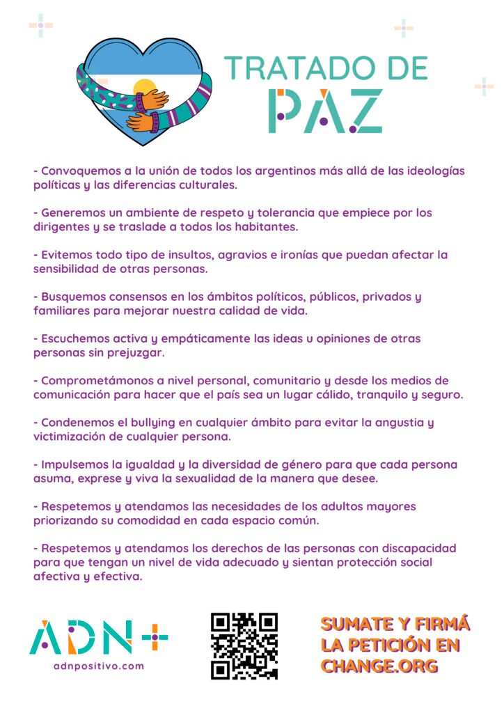 Esta podría ser una editorial más. Pero no lo es. Porque viene acompañada de una propuesta real para que lo que decimos quede ratificado en un papel. Desde ADN+, simplemente un portal de noticias, queremos proponer un Tratado de Paz. Por eso hicimos una petición en el famoso sitio Change.org para que nos acompañen en esta movida. El objetivo es juntar 100.000 firmas para que llegue a la clase política y comprometa a ésta para cumplirlo y comunicarlo más allá de quien gane las elecciones el 22 de octubre (o el 19 de noviembre si hay ballotage). Y que esa comunicación llegue a los 46 millones para que todos estemos otra vez del mismo lado. Para que eso suceda necesitamos hacer ruido.