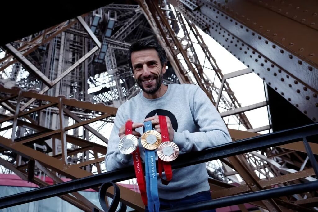 Tony Estanguet, presidente del Comité Organizador y campeón olímpico, con las flamantes medallas en la Torre Eiffel.