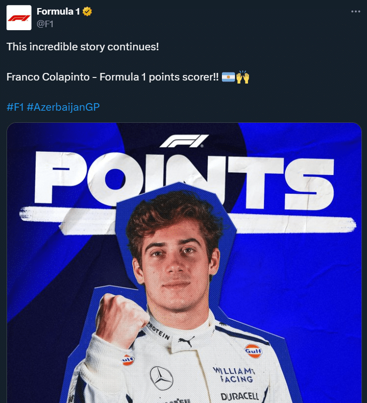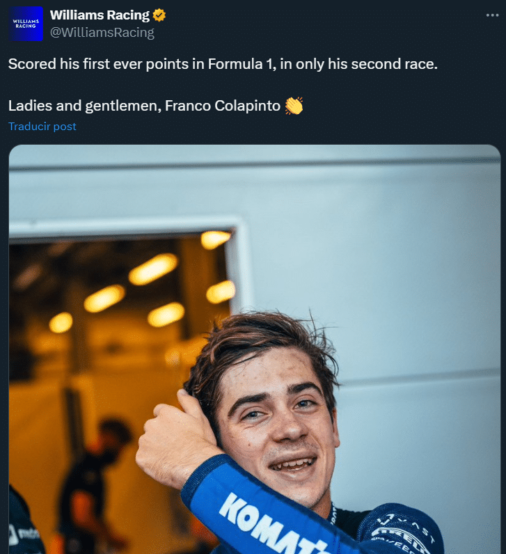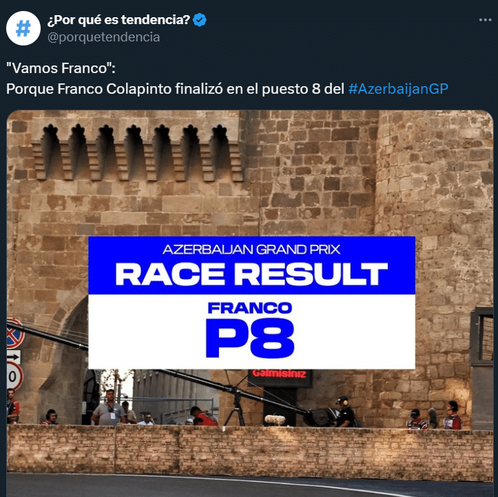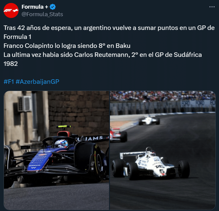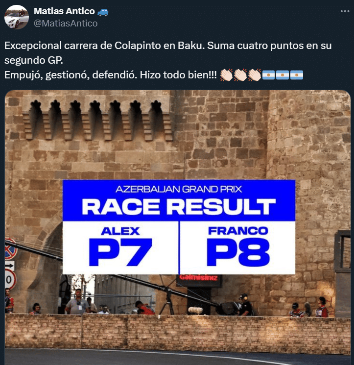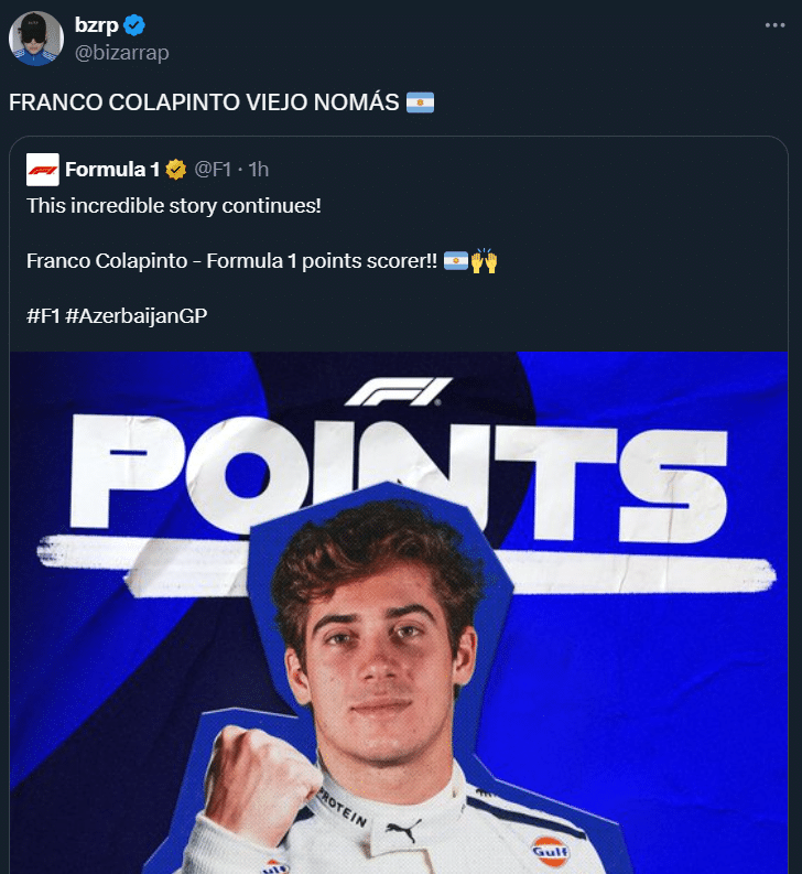 Es que las redes sociales se hicieron eco de forma estruendosa de la actuación de Colapinto en Azerbaiyán con un octavo puesto que no se olvidará tan fácilmente teniendo en cuenta que el argentino acaba de desembarcar en la Fórmula 1.