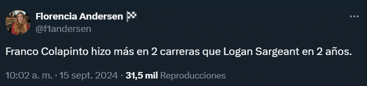 Los usuarios de las redes sociales se deshicieron en elogios hacia Colapinto. Inclusive, diversas personalidades y hasta distintas organizaciones se mostraron sorprendidas por la rápida adaptación del argentino a una categoría muy compleja.