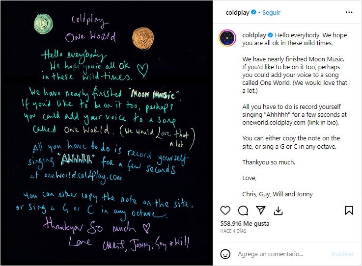 Coldplay es una de las bandas más exitosas y de mayor categoría de los últimos tiempos por su estilo musical, su puesta en escena en cada show y el carisma de sus integrantes: Chris Martin, Jonny Buckland, Guy Berryman, Will Champion y Phil Harvey. Este quinteto británico cuenta además con una distinguida creatividad y un vínculo especial con su público de todo el mundo y. por eso, el grupo lanzó una propuesta maravillosa para sus fanáticos. «Ya casi hemos terminado Moon Music. Si quisieras participar en él, tal vez podrías agregarle tu voz a una canción llamada ‘One World’. (Eso nos encantaría mucho)», anunció Coldplay en su sitio web oficial.