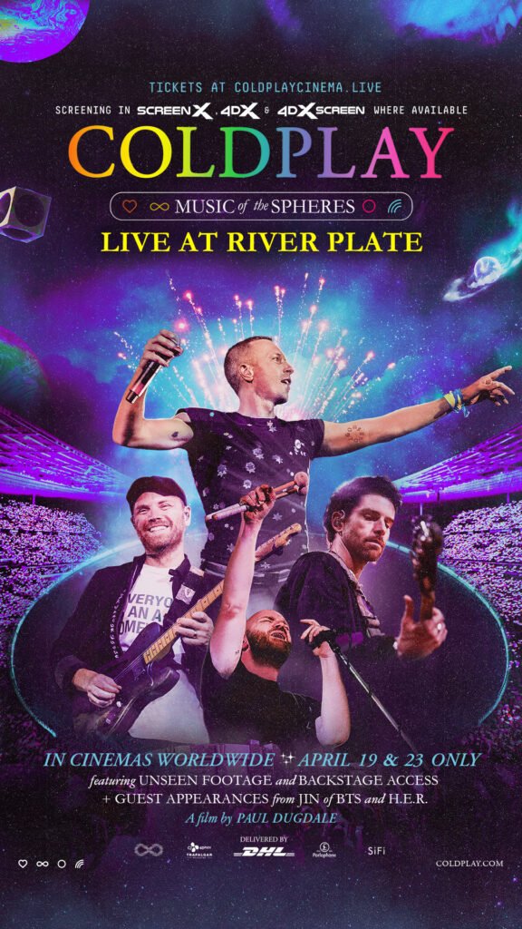 Entre el 19 y el 23 de abril, Music of the Spheres: Live at River Plate llegará a los cines de todo el mundo, el documental que retrata la serie de diez shows de Coldplay en River Plate, que contará con imágenes inéditas, entrevistas y el detrás de escena de cada fecha. Los tickets estarán a la venta desde el 8 de marzo en la web de la banda, y aún no hay precisiones de cuáles serán las salas donde podrá verse.