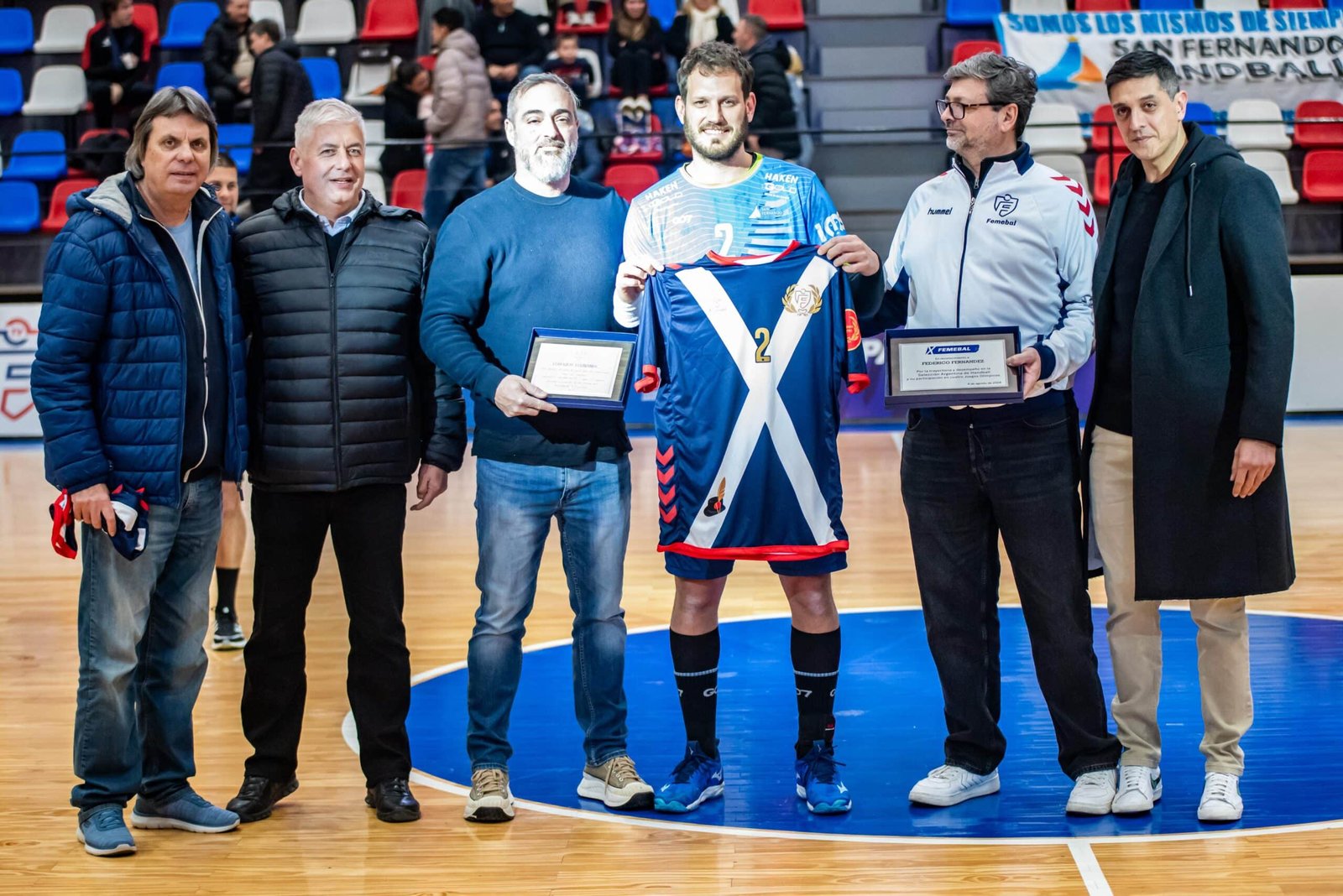 Segundos más tarde, el extremo izquierdo recibió una plaqueta y una camiseta de las manos de Gustavo Malventano, presidente de Fe.Me.Bal, Orlando Rockstroh, vicepresidente de la entidad, Daniel Giovagnola, secretario, Carlos Ferrea, presidente de CAH, y Sebastián Gallicchio, uno de los dueños de CH1 Sports, la marca deportiva que fabrica las pelotas que se utilizan en el torneo.