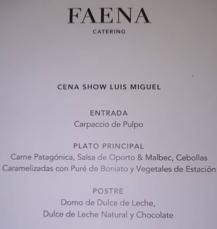 2.000 personas tuvieron acceso al show vip, que costó cerca de $ 1.200.000. La carta fue efectuada por el Hotel Faena y se ofreció una una entrada de carpaccio de pulpo. Como plato principal, carnes patagónicas con salsa de oporto y malbec, cebollas caramelizadas con puré de boñato y vegetales de estación. Y de postre, un domo de dulce de leche, con dulce de leche natural y chocolate.