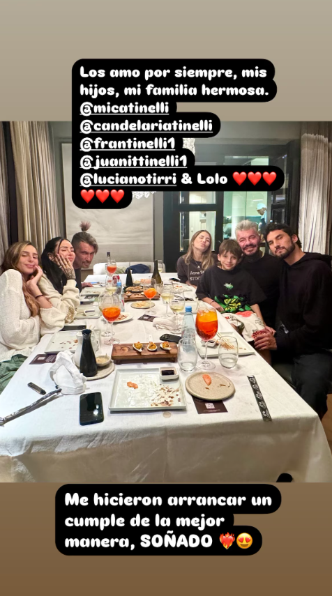 Así las cosas, Tinelli comenzó su cumpleaños con un encuentro privado con sus seres más cercanos en la actualidad. Cenó sushi junto a sus cinco hijos y a su primo, Luciano «El Tirri».