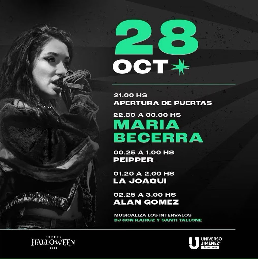La fiesta Creepy Halloween es un festival con ambientación tenebrosa, casa del terror, disfraces y música en vivo, en la que María Becerra y La Joaqui compartirán el escenario. El evento está a cargo del hijo de la Mona Jiménez y cuenta con una extensa y atractiva programación de 48 horas, que se iniciará el viernes 27 con los shows de Damián Córdoba y La Mona Jiménez y la participación de DJ Cabrito en los intervalos de ambos recitales.