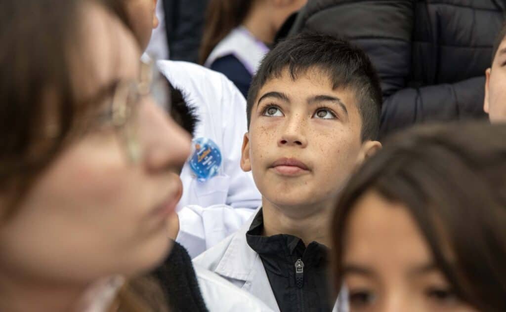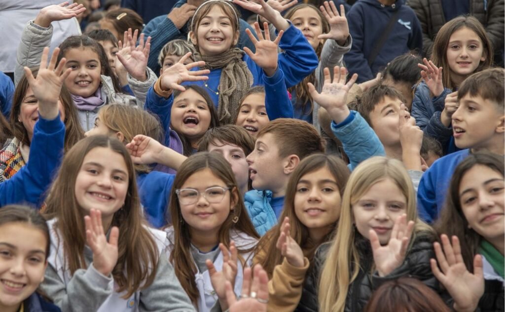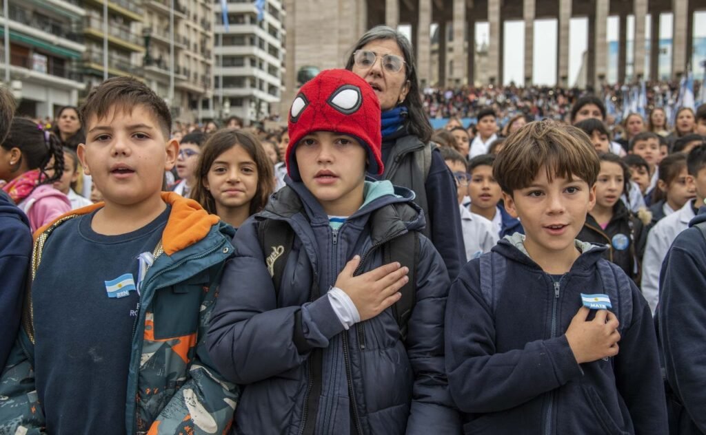 “¡Sí, prometo!”, gritaron al unísono chicos y chicas de 4° grado provenientes de distintos puntos de las provincias de Santa Fe, Córdoba, Buenos Aires, Entre Ríos y la Ciudad Autónoma de Buenos Aires tras escuchar atentamente al actor que caracteriza a Manuel Belgrano (Santiago Pereiro) en el patio cívico del Monumento Nacional a la Bandera, en lo que fue la primera jornada de la tradicional celebración por la que Rosario recibe a miles de niños y niñas cada año.