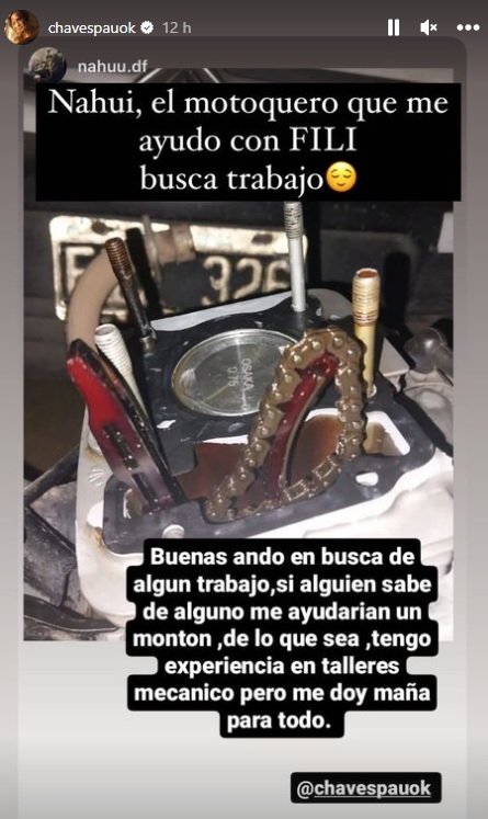 “Ando en busca de algún trabajo, si alguien sabe de alguno me ayudaría un montón, de lo que sea. Tengo experiencia en talleres mecánicos pero me doy maña para todo”, escribió el joven en sus historias. Al ser mencionada, la modelo no dudó en compartirlo con sus miles de seguidores. “Nahui, el motoquero que me ayudó con Fili busca trabajo”, tituló en su cuenta.