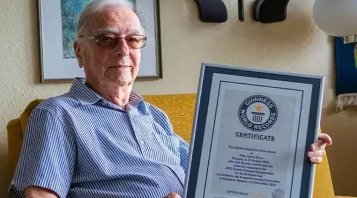 Por sus descollantes participaciones en las diferentes pistas, sumado a la gran vitalidad que todavía sostiene, le posibilitaron obtener un reconocimiento en el Libro Guinness de los Récords como el “esgrimista más viejo del mundo”. A su vez, arribó al emblemático libro de las marcas por la picardía de un familiar. “Mi nieto mayor me sorprendió con el reconocimiento, organizó todo sin mi consentimiento”, indicó Péter. Su nieto llamado Zsombor, llevó adelante la organización y reunió los documentos oficiales para comprobar los resultados de las competencias de las que fue parte Péter y de esa forma convertirse oficialmente en récord.