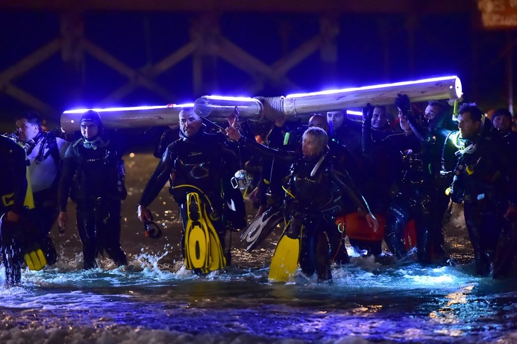 Luego de esto, los profesionales bajaron la cruz desde una grúa hasta la superficie marítima, para trasladarla minutos más tarde 8 metros hacia el fondo del mar. Con los buzos, nadadores y kayakistas sumergiéndose con la cruz iluminada de cuatro metros, las personas presentes se emocionaron y rompieron el emotivo silencio con aplausos.