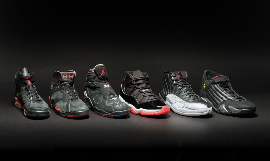 Una colección de seis pares de zapatillas deportivas Air Jordan usadas por la leyenda del básquet, Michael Jordan, durante los seis años que ganó el campeonato de la NBA (1991, 1992, 1993, 1996, 1997, 1998) fueron subastadas por la casa de remates Sotheby’s en Nueva York por el precio de ocho millones de dólares, estableciendo una cifra nunca antes alcanzada por un calzado usado en partidos.