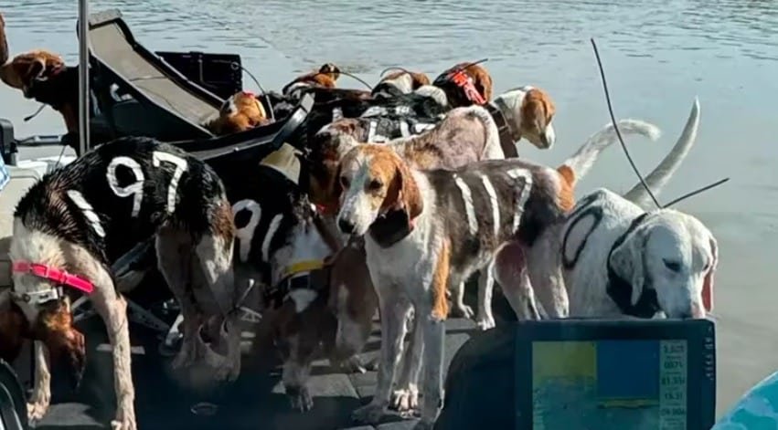 Al observar a los perros en el lago, el tercer hombre, que resultó clave, sugirió que debían verificar su estado. Cuando llegaron al lugar, se encontraron con numerosos perros de caza, claramente identificables por sus costosos collares de radio GPS, nadando desorientados y exhaustos, sin poder ver la orilla en ninguna dirección.